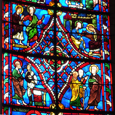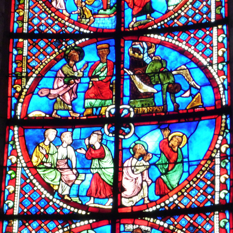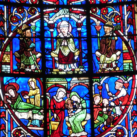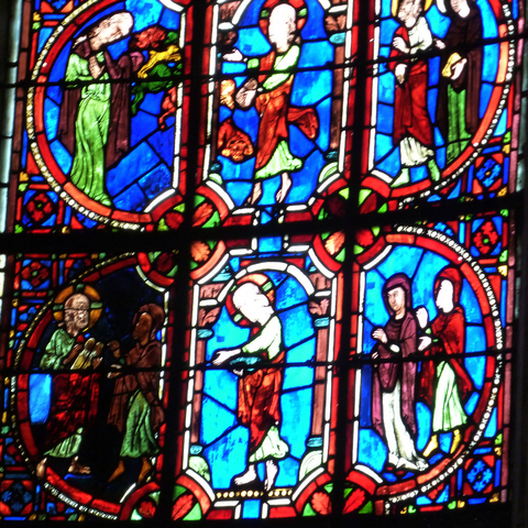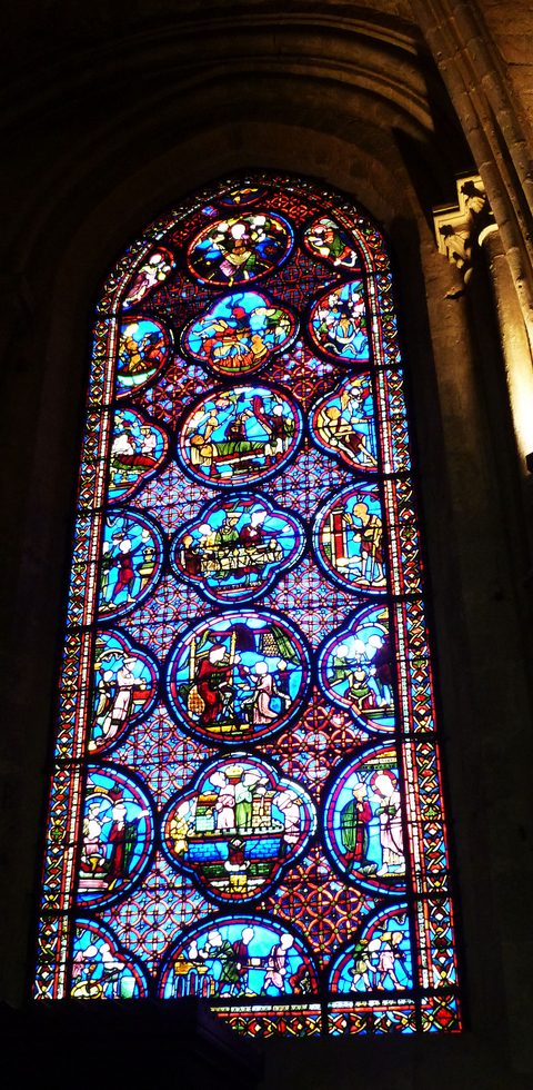 13C前半は、まだ大きなガラスシートが出来なかったので、各ピースも小さいです。きが遠くなります。赤いガラスがたくさん使われているのが、ブールジュ大聖堂の特徴です。