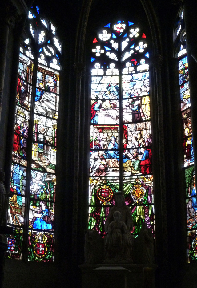 後陣の中央の礼拝堂には、三連の「聖母マリアの生涯」 のステンドグラスがあります。