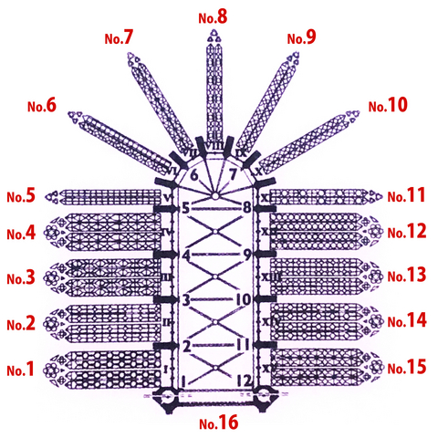 後陣のステンドグラスは、下の見取り図の (赤い文字の) No.5 〜 No.11 の7本です。