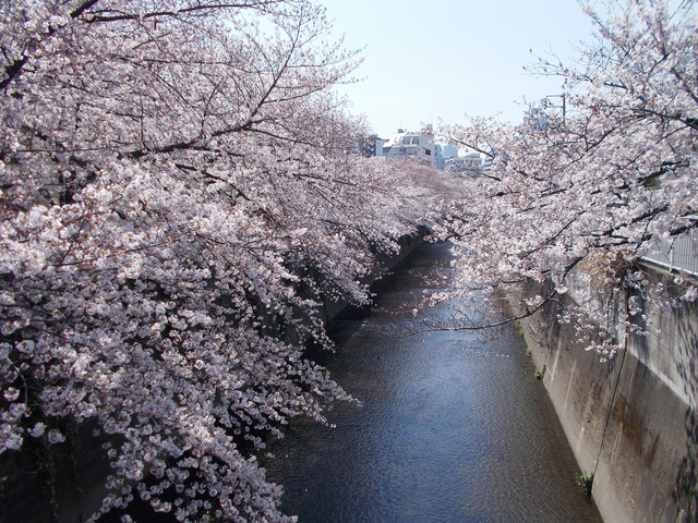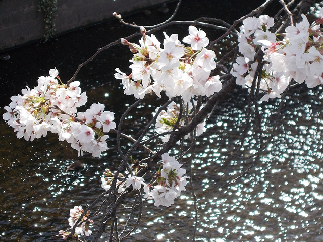 川面がキラキラして、花びらが少しだけ散って浮いているのかな?