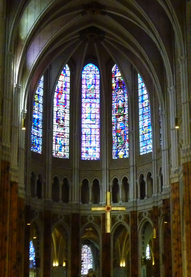 朝一で行ったので、後陣は朝日でステンドグラスが輝いています。