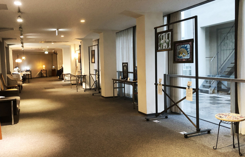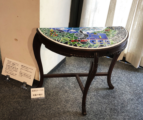 木のテーブルはアンティークの時代物で、天板の作品とのギャップを楽しんでいただけたら嬉しいです。