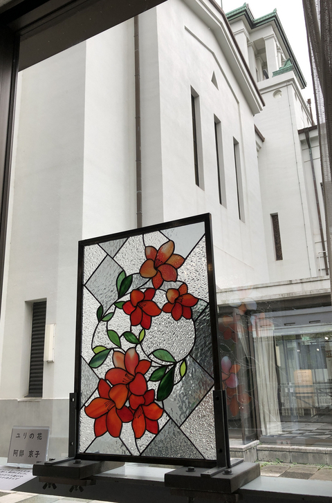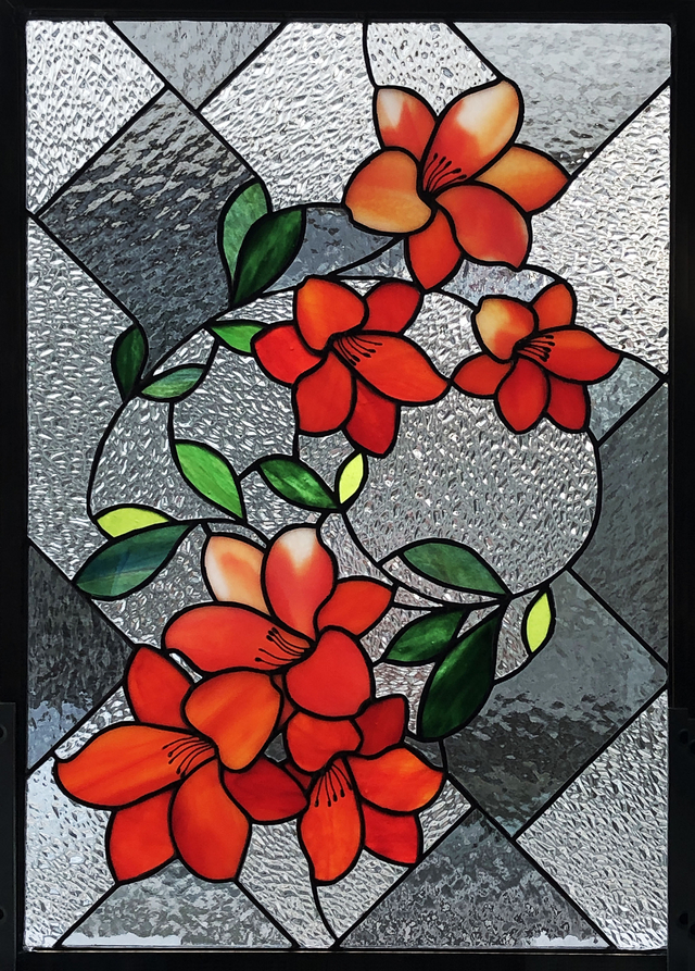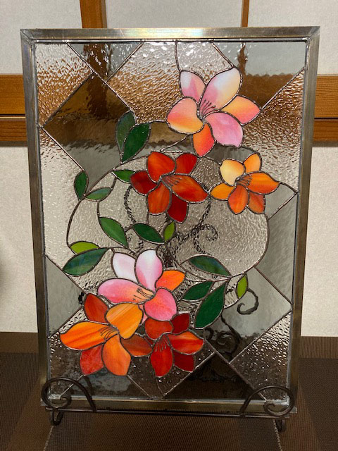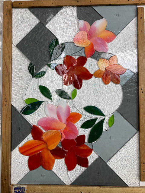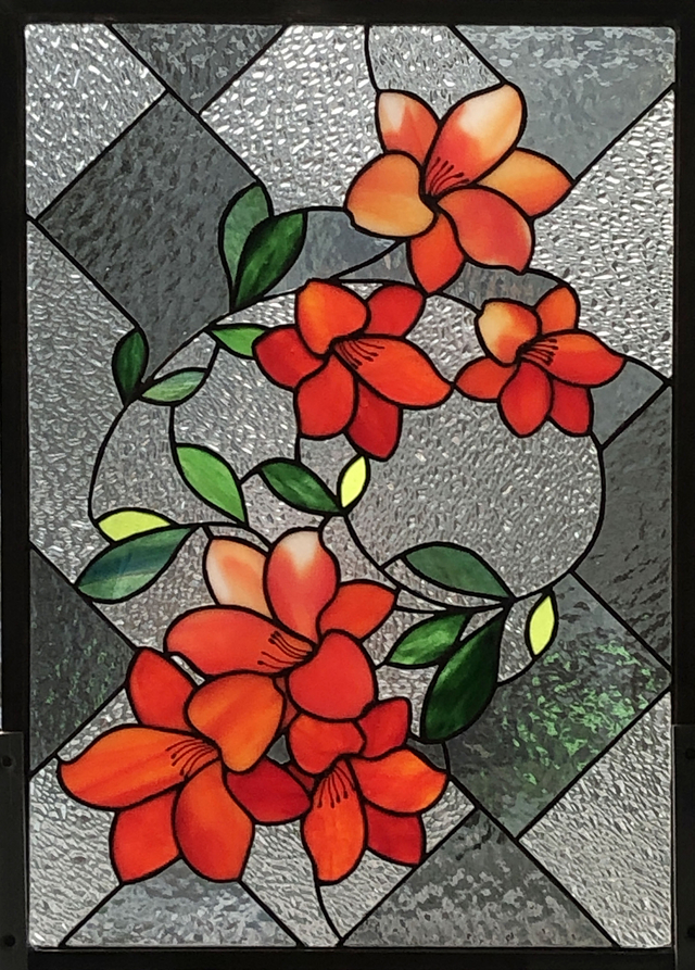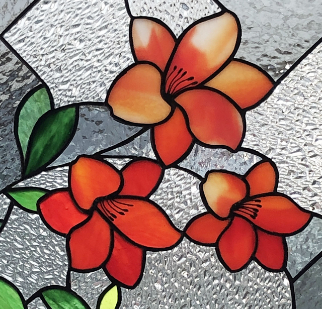 花よりも、背景のガラス選びやカット線がなかなか決まらず苦心しました。