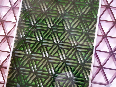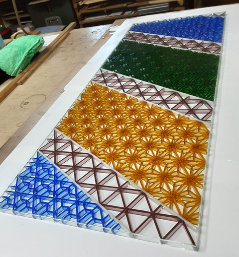 それぞれの色のガラスを8ミリ幅でガラスカットし、「立てて」 あります。