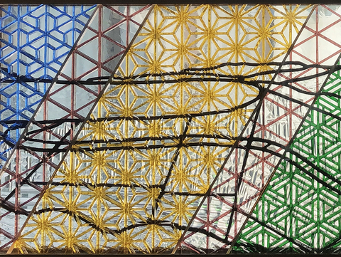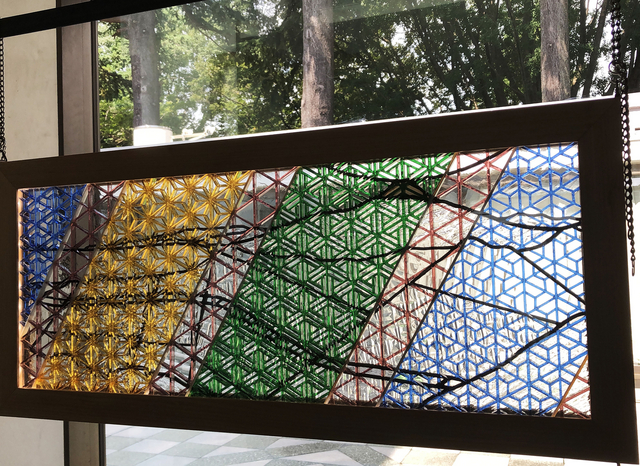組子のパネルの背面に鉛線で組まれたステンドグラスが当ててあります。