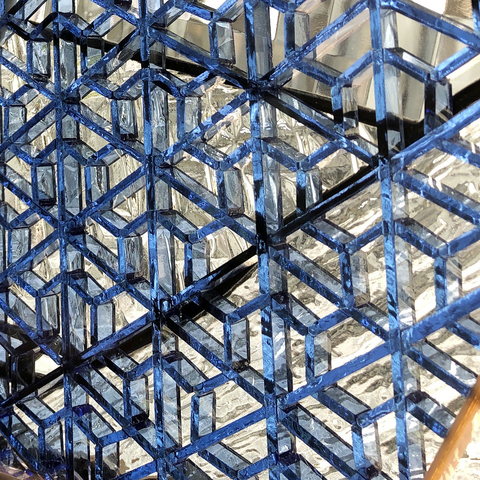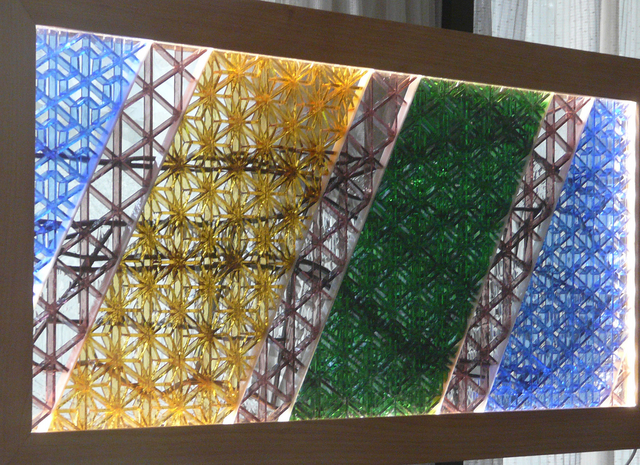 前面の組子は、青は「毘沙門亀甲」、アンバーは「麻の葉」、緑は「毘沙門剣つなぎ」、紫は「三つ組手」です。