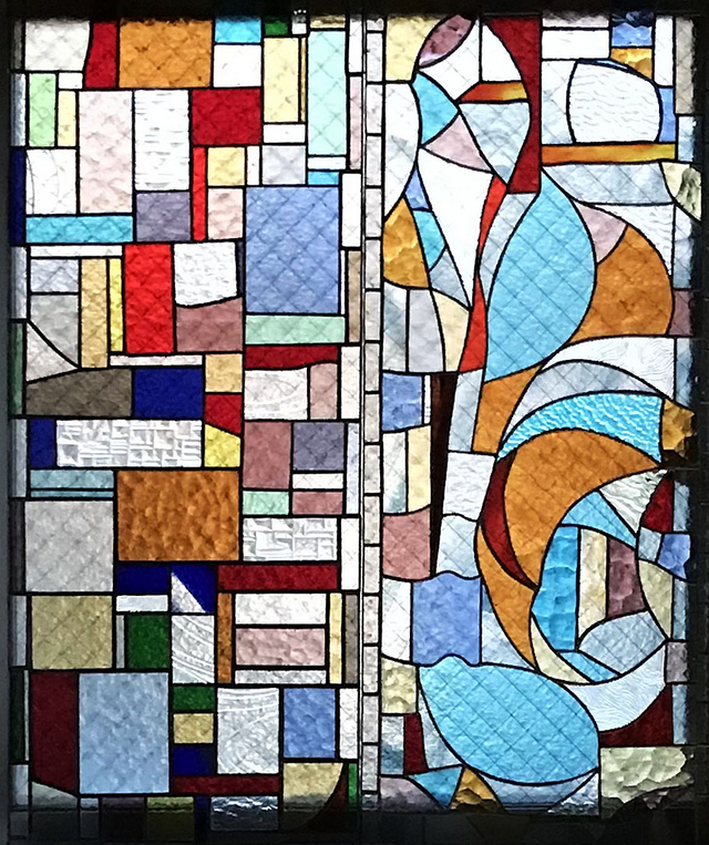 先に完成した作品の右隣に設置しましたが、偶然、青系のガラスが斜めに配置される構図になっており、一枚に見えないこともなく、出来上がりには満足しています。