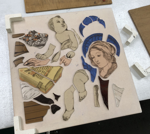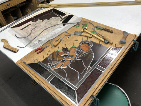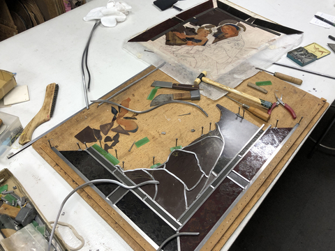 焼成したガラスを、板ガラスにロウで留めて、グリザイユを全面に塗ります。
