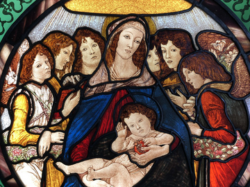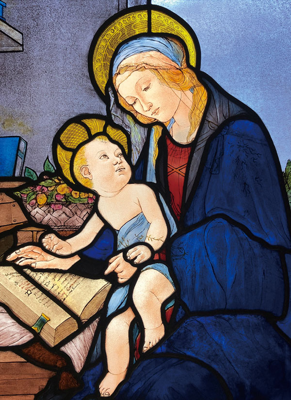 聖母マリアの青い衣装に金の糸で刺繍されている星は、「マギ(東方の三博士)の礼拝」を表す。