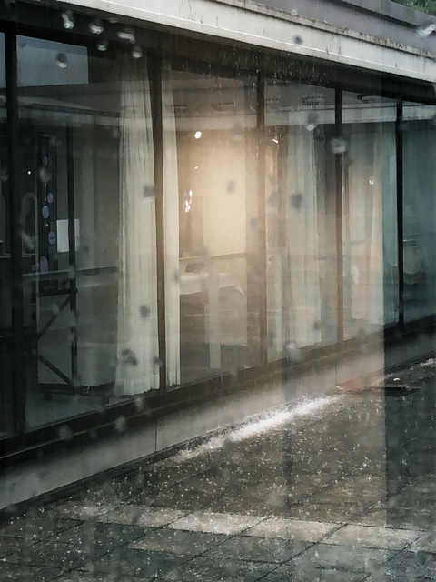 雨が降っているように見えるガラスを手前にして撮った写真。