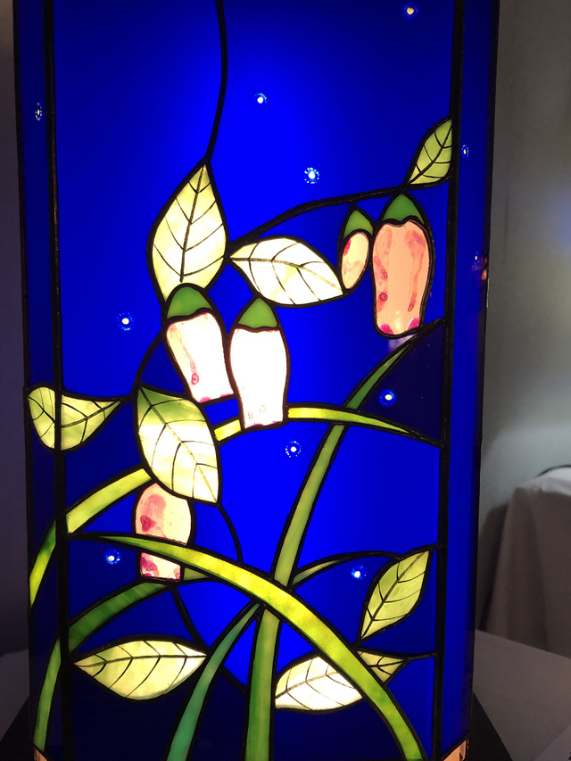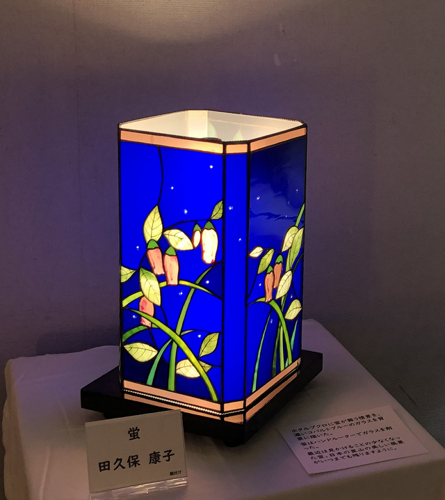 ホタルブクロに蛍が舞う情景を濃いコバルトブルーのガラスを背景に描いた。