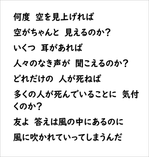 代表作「風に吹かれて」の3番の歌詞を描きました。