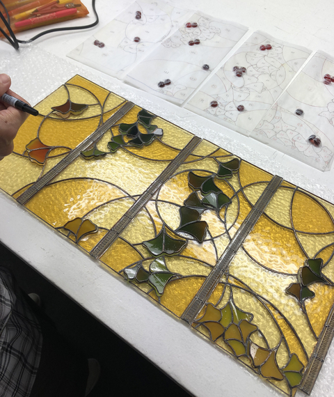 ぎんなん用のガラスは、色にこだわり、複数の色のガラスを重ねてフュージングで制作。