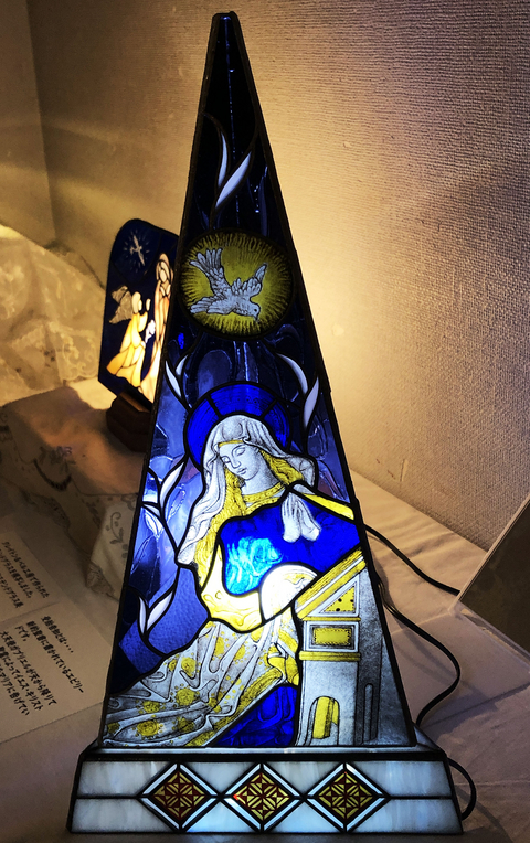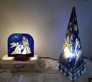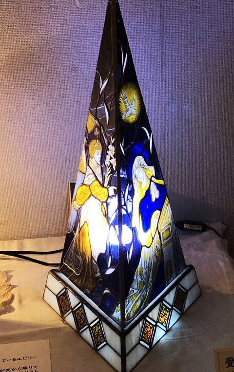 台座のサンドブラスト模様は、同じステンドグラスの背景を参考にしました。