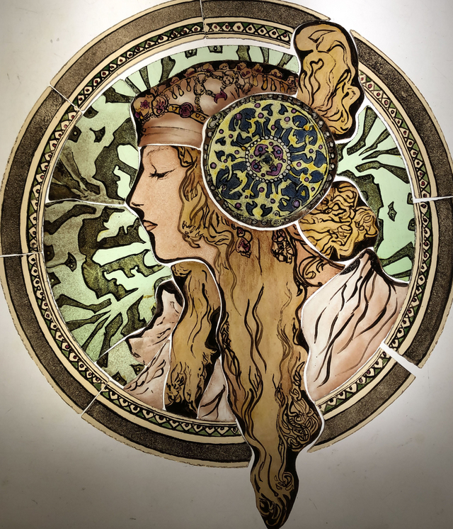 ミュシャの「ビザンティン風の頭部」は二枚組の作品ですが、そのうちのブロンドの方をステンドグラスにした作品をご紹介します。