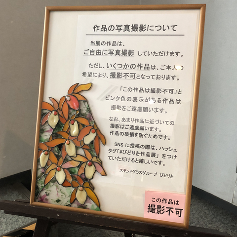 階段の上の左側に、びどりを作品展のポスターを掲示しています。