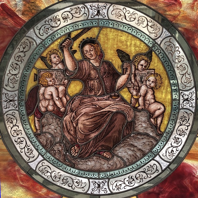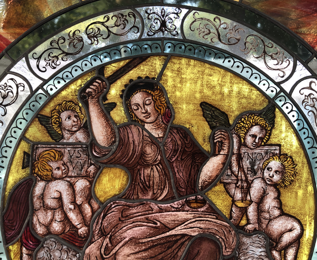 剣と天秤を持って、天使達に囲まれている女神様は、優しい表情をしていますが、強い正義感がにじみ出ているかと思います。