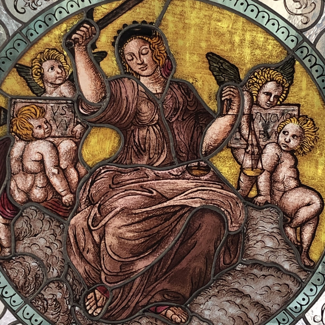 剣と天秤を持って、天使達に囲まれている女神様は、優しい表情をしていますが、強い正義感がにじみ出ているかと思います。