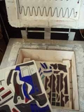 鉛線で組む前のガラスを“ろう”で貼り付ければ、壁面に設置したライトボックスに “立てて” 、絵をかくことができます。