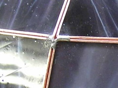 4.全部のガラスをつけたら、隙間がないか確認しながら、(下の右側の写真のような)四つ角を半田付けして留めていきます。