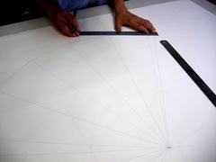 扇形を開いた展開図を、何角で作るかによって分割してから、そこに絵を描いていきます。
