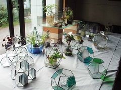 下の写真は、びどりを有志による 「いろいろな形のテラリウム」 コーナー。およそ50点です。いろいろな方が設計すると、本当にいろいろな形が出来ます。観葉植物を植え込んであるもの&ないもの、上から吊るもの、窓際などに置くもの、食卓に置くもの、大きいもの、小さいもの・・・ いろいろ取り揃えてあります。これだけ並ぶと楽しい!!!