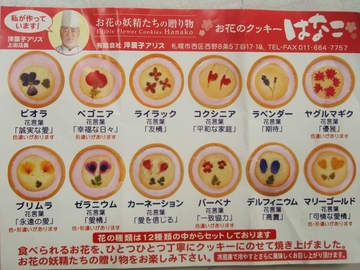 食べられるお花をクッキーにしたもので、花言葉付きなんだそうです。生徒さんに選んでもらい、花言葉を調べると、「誠実な愛」、「永遠の愛」、「平和な家庭」・・・など。皆さん、フムフム・・・と召し上がっていました。