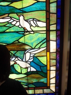 このように別の大窓には、ポーハタン号が横浜を出港する風景を表わしたステンドグラスがあります。こちらは、数年前に既に修復を終えていました。どちらのパネルも、アメリカから新しい手法を持ち帰ったばかり、ココモ(米国のガラスメーカー)が多く使われていました。