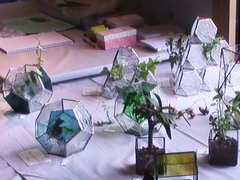 以前から「立体の設計」には定評があり、おもろしろい形のステンドグラスをいろいろと制作していらっしゃいます。この企画展には、ランプ、テラリウム、クリスマス小物などが、おしゃれに並んでいました。