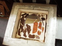 ↓ 焼成が終わったので、鉛線で組み、半田付けをして、パテを詰めます。3日くらいしてパテが乾いたら、パテ掃除をし磨いて完成です。