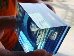 「曲面、平面何でも光らせて見せましょう!」とのことだったので、研磨前の積層ガラス(ガラスを複数重ね合わせて接着したもの)を持参。この研磨をデモンストレーションしていただきました。