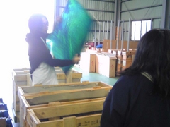 その後、ランバーツの定番のガラス棚へ。同じ番号でも一枚一枚流れと色合いが違うので、これも一枚一枚出してみて、自分好みの部分を選びます。皆さん、イメージと合ったガラスがあったようで、ニコニコしていました。