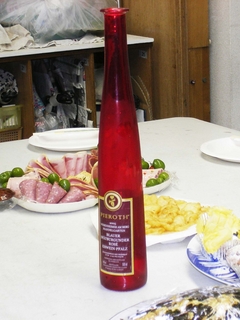 美しい赤いガラスのボトルは、食前酒のアイスワイン。飲んだこともない、おいしいワインでした。