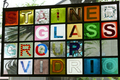 「ステンドグラスグループ びどりを」の会員がいろいろな技法で一枚のステンドグラスパネルを作りました。絵付け、フュージング、サンドブラスト・・・ などすべて違う表現方法で文字を作りました。自分の得意な技法で作った人、やったことのない技法で作った人・・・ 出来上がって見ると、わりと小さいパネルなのですが、まとまるのは大変だったんですよ〜。