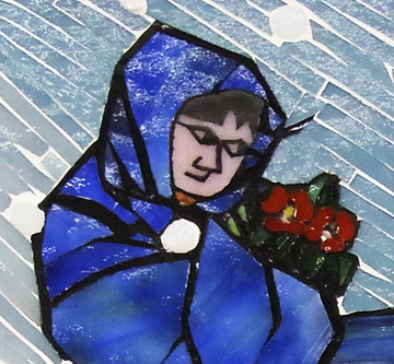びどりを展の時も見入ってしまいました。切り絵の雰囲気がとてもよく出ていたと思います。吹雪の中で落ちた椿を見る目。着物の目地の色を吹雪の目地と使い分けたり、目地の幅を変えたりして着ている感じが出ていると思いました。壁に一枚掛けてあったら素敵だな。