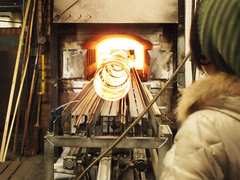 シリンダーの上部にはカッターでスコアを入れた割れ目がありますから、窯の中でシリンダーが熱せられトロンとしてきて、両側に開いていきます。窯の反対側に職人さんが待ち受けていて、両側に開いていくガラスを、棒? でうまく左右に開いたかを確認? 補佐? します。