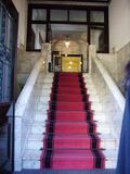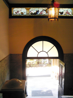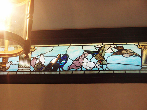 正面玄関を入るとまず大理石の立派な階段があります。この階段の上で後を振り返ると、19羽の鳩をモチーフにしたステンドグラスが見えます。