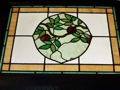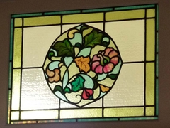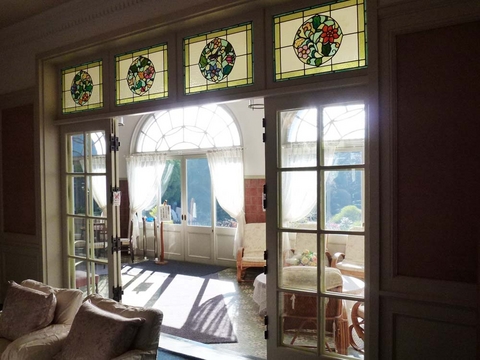 まず、サンルームと隣接している応接間の欄間です。ガラスは外壁に面していれば、酸性雨などで浸食されガラスがボロボロになっていきますが、このステンドグラスは外壁に面しているわけではないので、そんなに修復の必要がなかったのでしょうか・・・ オリジナルのまま残っていたのでしょうか・・・