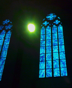 今日も、昨年訪れた聖シュテファン教会(ドイツのマインツ)のステンドグラスのレポートです。教会に入り、東側の祭壇に向かって、右を向けば南側に下の写真のようなステンドグラスが3本並んでいます。左を向いても3本並んでいます。