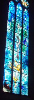 聖シュテファン教会のステンドグラスは、シャガールの他のステンドグラスにも見られるように、被せ(きせ)ガラス(フラッシュガラス)を使い、青い部分を酸で抜いてグラデーションを出しています。