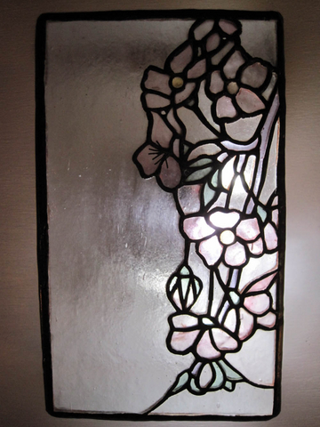 【コメント】 コードレスのブラケットです。乾電池でLEDランプをつけています。小さめの作品なので花弁のカットに苦労しました。地のガラスのカットはさらに大変でした。