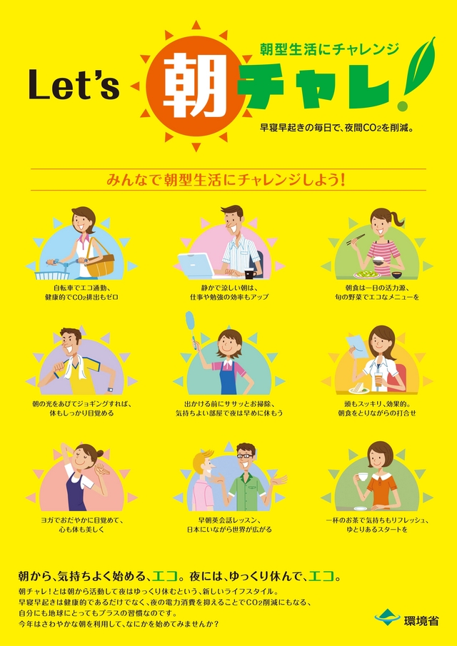 もう一つよく聞くようになった言葉に 「朝チャレ」 があります。これは「地球温暖化防止の国民的運動、チャレンジ25キャンペーン」 の一つです。