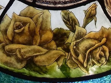 「薔薇がいっぱい」 のブログで、薔薇をモチーフにしたステンドグラスを期待された方も多いはず。さっそく、2010年9月に開催した、第30回 びどりを作品展 出品作の中から薔薇をデザインしたステンドグラスをご紹介します。