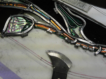 フュージングしたパーツを鉛線で組みます。では、出来上がりは次回のブログをご覧ください。