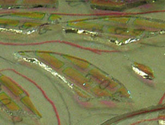 昨年、工房ではダイクロガラスを使ったフュージングをする人がとても多かったです。かくいう私もあの “キラキラ” にハマってましたね〜 (1) (2)。 以前ご紹介した、この作品も、ダイクロガラスを多用していました。
