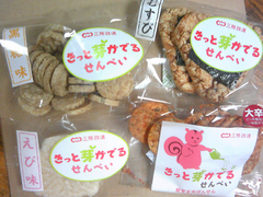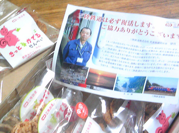 「きっと芽が出るせんべい」の原料だった発芽玄米の釜石の民間工場は被災を免れ、宮古白浜調達(岩手県三陸産)のスキ昆布も在庫が残っていて発売することができたということです。