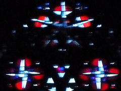 碁盤状に組まれているステンドグラスは、ずいぶんとたわんできていました。碁盤状のステンドグラスって、鉛線の組み方にもよりますが、概してたわみやすいですね。