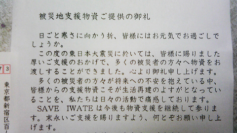 “食べて復興支援” のブログを掲載したばかりですが、折しも今日、11/22まで “支援物資を送ろう” として皆で支援物資を集めて送っていた “SAVE IWATE” からお礼状が届きました。