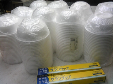 また、今回は物資より現金で寄付してくださった方が多かったので、まとめて、以下の物を購入しました。炊き出し用の丼(250個)とサランラップ等です。