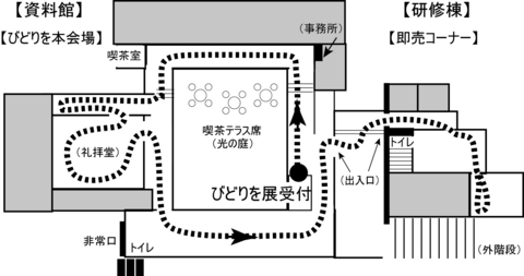 受付で、皆様に順路が印刷された目録をお渡ししますので、見過ごす箇所がないようお気を付けいただきますようお願いいたします。